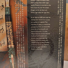 Xuanwu is written as "玄武" in Chinese characters. ”玄"(Xuan) means black, and black is the color of the north in the Five Element Theory, representing water. So, Xuanwu is the water god who protects the north. As stated above, the figure of Xuanwu takes the form of a combined turtle-snake statue. Sometimes, the long-legged turtle is depicted with a snake wrapping around it.